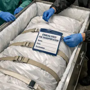 Professional embalming preparation for transportation, showing sealed protective wrapping, identification tagging, and sterile handling environment.